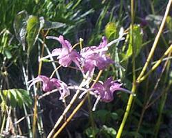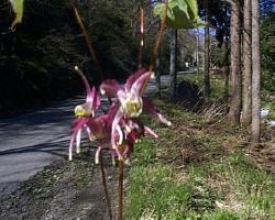 | 萼片は濃いピンク。花弁は白で、距は先が白 く付け根がピンクがかる。 |