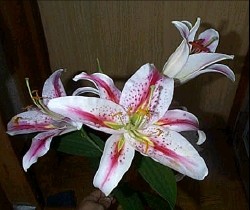 オリエンタル系の改良品種で赤筋に赤い斑点のスターゲーザータイプの綺麗な花です。