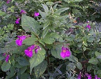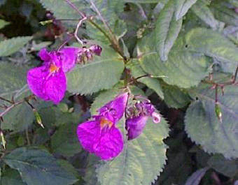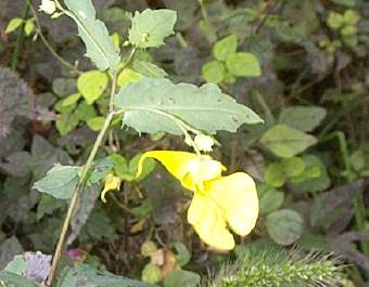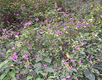黄色のキツリフネもあります。右下はツリフネソウとキツリフネが混在しています。